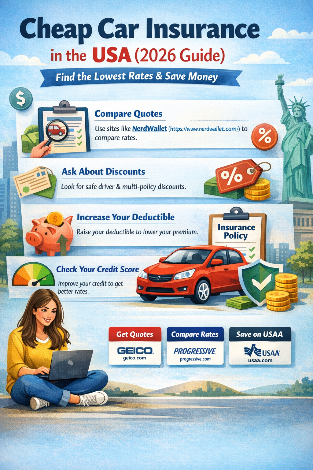 Finding cheap car insurance in the USA is possible with the right strategy. By comparing multiple quotes, choosing appropriate coverage, and taking advantage of discounts, drivers can significantly reduce their insurance costs.